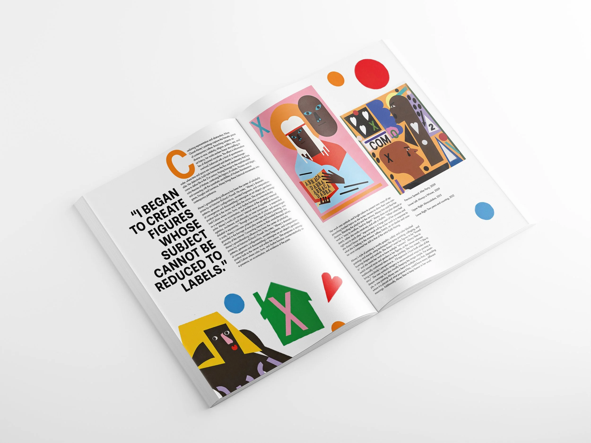 This project was aiming to create a magazine spread inspired by the Artist Nina Chanel Abney, who is a current working contemporary pop artist. Her use of simple shapes and strong bold colors is a huge part of her work. I wanted to incorporate her visual language into the design of these spreads. By duplicating and recreating these shapes they give a balance to the composition while also relating to the simple yet expressive san serif fonts chosen.